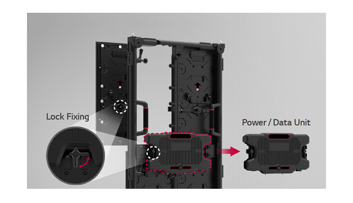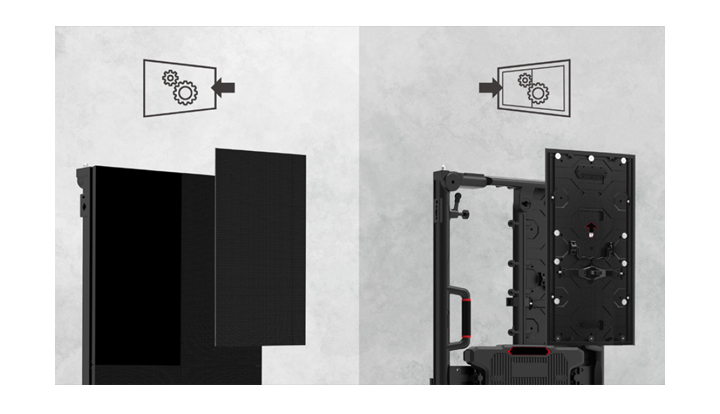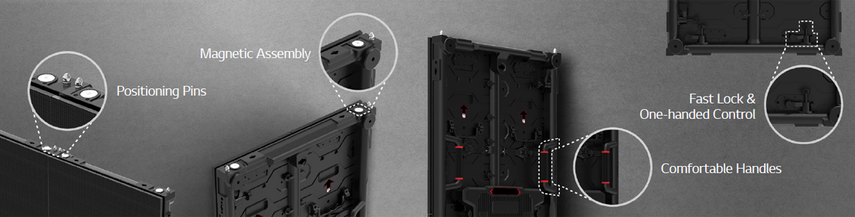Nhiều yếu tố bao gồm nam châm ở trên và dưới, chốt định vị, tay cầm và khóa nhanh giúp người lắp đặt dễ dàng lắp đặt và tháo dỡ màn hình LED mà không cần thêm dụng cụ nào khác.