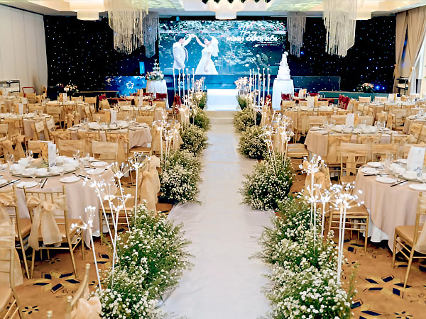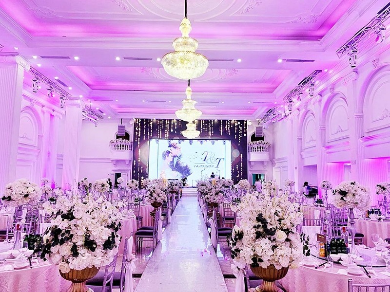 - Thiết kế thi công tỉ mỉ, tăng tính thẩm mỹ cho không gian tiệc cưới sang trọng, hiện đại