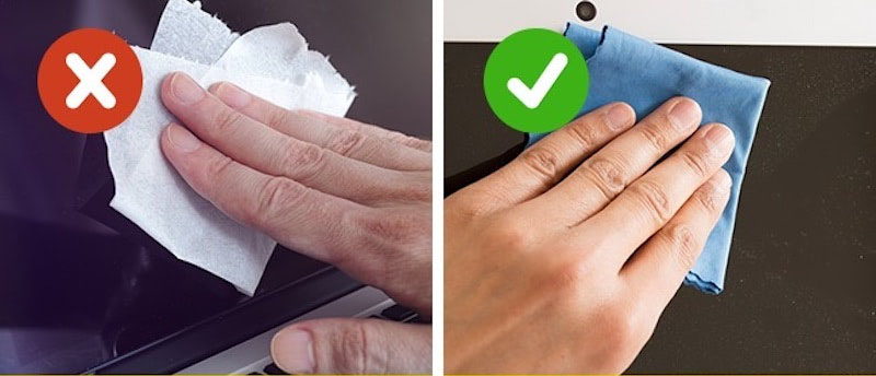 Sử dụng một khăn mềm như khăn microfiber để lau nhẹ nhàng bề mặt màn hình và loại bỏ bụi bẩn. Đảm bảo không sử dụng khăn có chất tẩy mạnh hoặc các chất hóa học có thể làm hỏng màn hình.