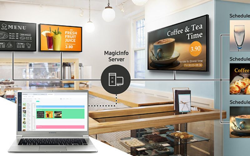 - Quảng cáo trong nhà hàng và quán café: Các màn hình Digital Signage trong nhà hàng, quán café được sử dụng để hiển thị menu, chương trình khuyến mãi và thông tin giải trí, giúp cải thiện trải nghiệm khách hàng và thúc đẩy doanh số bán hàng.