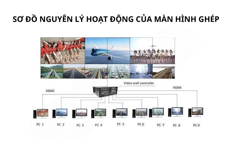 Nguyên lý hoạt động của màn hình ghép dựa trên việc chia nhỏ tín hiệu hình ảnh từ nguồn phát (máy tính, camera, đầu phát, hệ thống giám sát) thành nhiều phần tương ứng với từng màn hình con.