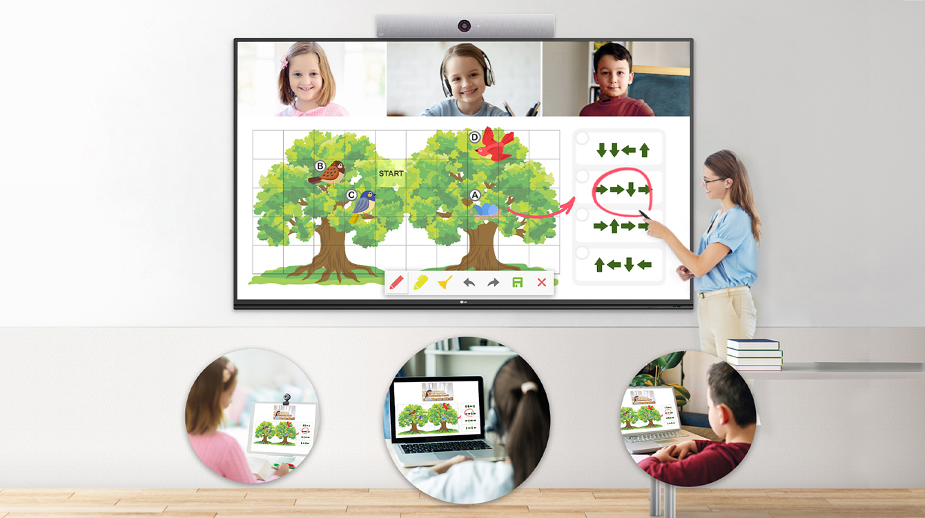 Trong khi đó, với màn hình tương tác thông minh, bản thân sản phẩm được thiết kế để sở hữu bản chất tương tác. Công nghệ cảm ứng cho phép người dùng trực tiếp tương tác và điều khiển trên bề mặt màn hình. Thầy/cô có thể dễ dàng tùy chọn công cụ: các loại bút, tay, các công cụ tẩy xóa, vẽ,… có sẵn đang hiển thị để viết hoặc bút cảm ứng mà không cần chuột, bàn phím hay những thiết bị ngoại vi khác để hỗ trợ. Điều này làm cho bài giảng của thầy/cô trở nên sinh động và chuyên nghiệp hơn thông thường.