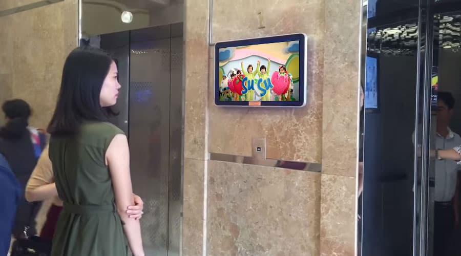 Hình thức quảng cáo màn hình Lcd treo tường tại sảnh chờ thang máy.