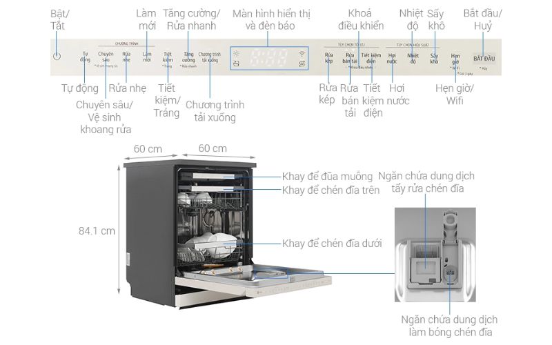 - Chế độ Eco: thích hợp cho rửa hàng ngày, ít dầu mỡ – tiết kiệm điện nước tối đa.